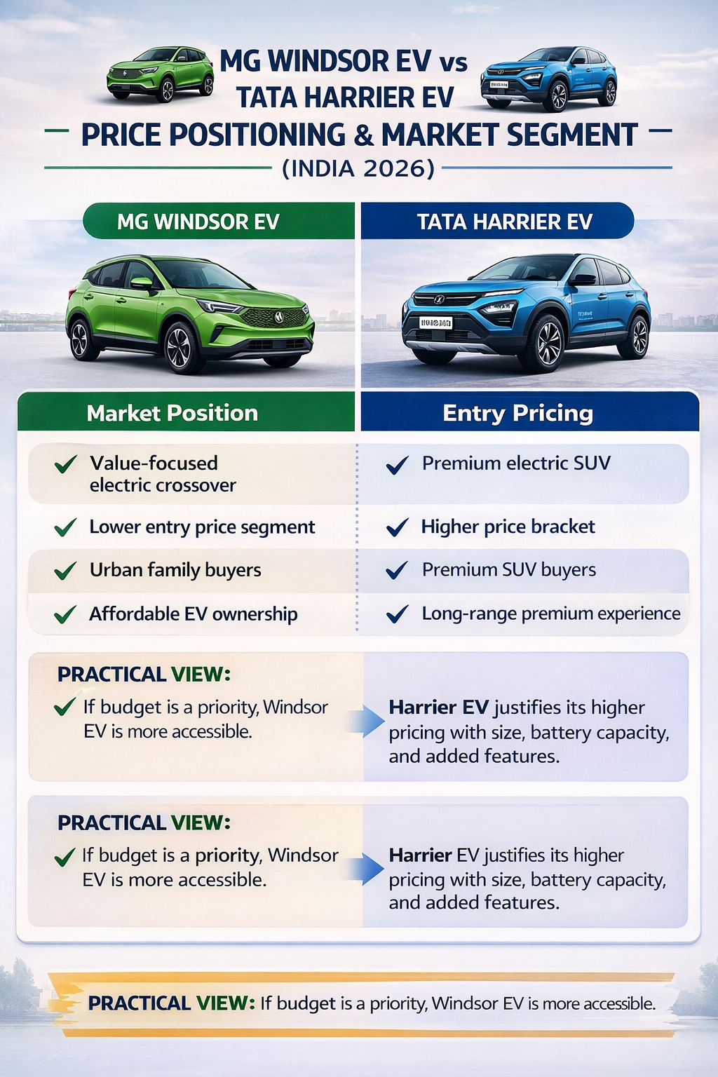 Pricing & Value Proposition: Windsor EV is positioned to attract urban buyers seeking practicality and efficiency, while Harrier EV targets customers looking for premium size and SUV presence.